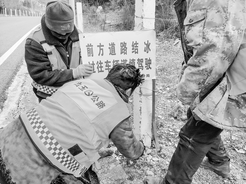 冬季氣溫下降,在夜晚形成結冰現(xiàn)象,易造成汽車打滑,難以控制,對過往車輛安全造成極大威脅。白玉公路分局出動人員 450 人、 車輛72輛次,對管養(yǎng)轄區(qū)道路全線進行警示牌的安裝。同時,對有暗冰、陰山積雪等路段及時拋灑防滑沙和融雪劑,確保道路行駛安全。