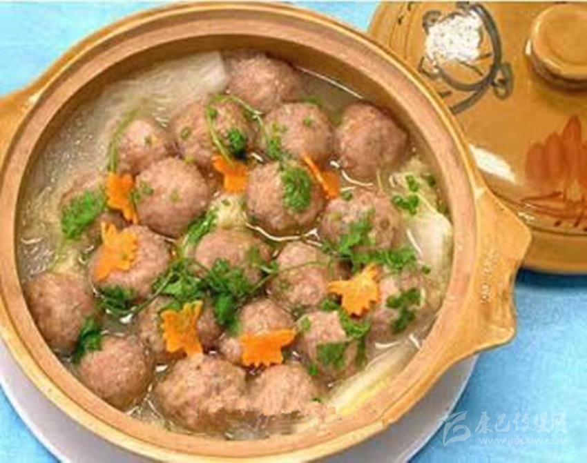 4、用微火把菜鍋中的酥油化成液體后加入生姜片、鹽、野生蒜、少量水、水?dāng)嚩狗?,煨成出現(xiàn)沸泡的時候,澆在魚肉丸子上蟲草魚肉丸這道菜做成了。