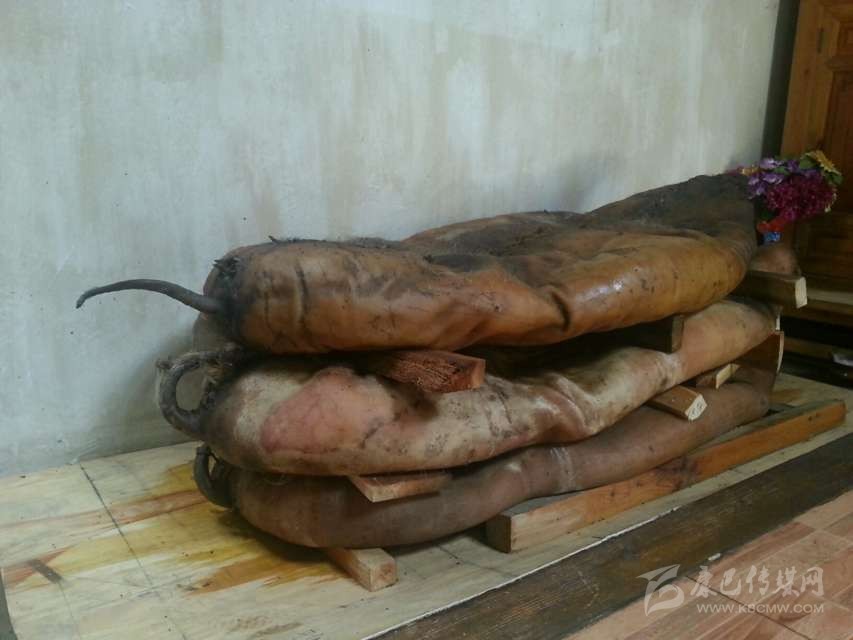 半干豬肉:在丹巴縣革什扎鄉(xiāng)有一種比較奇特的豬肉保存方法:將豬殺死后,不去毛,只在豬的腹部開一條口子取出內(nèi)臟,將血水清理干凈后用麻繩將腹部縫合。隨后用當(dāng)?shù)氐狞S泥漿敷在豬身上,在豬的身上形成一個(gè)厚約2厘米的殼,密不透風(fēng)。處理好后將其懸掛于灶塘之上,使黃泥在高溫的烘烤下快速硬化。如若發(fā)現(xiàn)黃泥層出現(xiàn)裂縫,立即用黃泥漿將其修復(fù)。等到第二年熱天時(shí),敲掉黃泥形成的硬殼,豬毛被輕松退去,豬肉依然比較新鮮。但這種保存新鮮豬肉的方法現(xiàn)在已經(jīng)很少見了,一是因?yàn)檫@種保存方法風(fēng)險(xiǎn)太大,稍有不慎豬肉就可能腐敗;二是如今物資供應(yīng)豐富,新鮮豬肉購買方便,使得此種儲存方式失去了存在的價(jià)值。