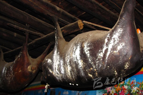 豬膘:在丹巴,豬膘是一種貯存豬肉的方式,是一種飲食習(xí)俗,同時(shí),它又是財(cái)富的象征。在丹巴隨便走進(jìn)一戶人家都可以看到少則幾扇、多則十余扇的豬膘掛在樓上,有些人家的豬膘甚至還貯存十多年之久。這些豬膘大多已經(jīng)被蟲吃掉了許多,但是他們也不會(huì)心痛,因?yàn)樵谶^去,看一個(gè)丹巴人家庭是否富裕,就看他家有多少豬膘,豬膘越多就越富有。