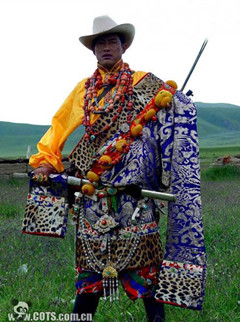吐蕃時(shí)期   藏族服飾文化有了較大的發(fā)展。"中二丁王"時(shí)(相當(dāng)于中原西漢中期),南方雅隆河谷的吐蕃開始了冶煉鐵、銅、銀等礦產(chǎn),為金屬飾品的出現(xiàn)創(chuàng)造了條件。藏史記載,公元三世紀(jì)的拉妥妥日年贊時(shí),吐蕃贊普的服飾巳與眾不同,出現(xiàn)了服飾等級(jí)的差異。史載松贊干布時(shí)期,吐蕃的歷史翻開了新的一頁,吐蕃文化得到迅速的發(fā)展,其服飾文化日漸發(fā)達(dá)。吐蕃奴隸制王朝等級(jí)森嚴(yán),在服飾上的表現(xiàn)也日臻完備。從反映吐蕃盛時(shí)的敦煌壁畫可看出,君臣服飾的等級(jí)差異,藏王一般只有贊普才能使用的三瓣寶冠箍住的有凹槽裝飾的無沿帽,呈紅色,通常高于一般人的帽子;藏王的侍從或臣下往往戴平頂無沿帽。衣袍的式樣也各有不同,官吏的章飾規(guī)定有一等瑟瑟,二等金,三等金包銀,四等銀,五等銅,六等鐵等大小兩類,共十二級(jí),裝在方圓三寸的盒子里掛在胸前,以區(qū)別職位的高低。武將的頭盔有形如塔的裝飾,戰(zhàn)士頭盔上有三只彩旗以表示出生的年月,隨著"惟以淬礪為業(yè)"的吐蕃冶煉業(yè)的發(fā)展,軍隊(duì)的鎧胄日趨精良,有的周身僅露兩個(gè)眼窩,勁弓利刃常不能破,其威嚴(yán)、勇猛之氣在今天大昭寺壁畫的吐蕃武士像中尚歷歷在目。吐蕃貴族不僅本人穿著華貴,還在聚會(huì)宴客時(shí),把傭人裝飾起來。而作為贊普的松贊干布則用一種紅帶子包頭,身著長袍,足穿腳尖朝上的靴子,據(jù)《紅史》載,這種王服是受波斯王朝的影響,反映了文化交往已影響到了服飾文化層次,而從松贊干布伊始的吐蕃與中原的密切交往,兩種民族文化的長期接觸更為藏族服飾的發(fā)展注入了新鮮血液。史載文成公主進(jìn)藏時(shí),帶入諸種花緞、錦、綾羅與諸色衣料二萬匹,還有大量的金玉器具。松贊干布及吐蕃大臣紛紛自行去掉氈裘,改穿絹綺。近代西藏的高級(jí)官吏,頭發(fā)綰成一髻,戴金翅白紗帽,這是唐代進(jìn)士的服飾。此外,還采納文成公主建議,令國人禁止"赭面"(用油涂面),文成公主進(jìn)藏還帶來了種植蠶桑和紡織技術(shù),"植??椊z兮"大大的促進(jìn)了吐蕃服飾技藝的發(fā)展,青海海西州都蘭出土的大批吐蕃服飾文物,真實(shí)、生動(dòng)地反映了吐蕃服飾的工藝水平。服裝的織物紋樣多為聯(lián)珠動(dòng)物紋,裝飾品的金質(zhì)首飾、佩飾的精美使人嘆為觀止。今天藏族婦女飾品的鑲嵌形制,可以從這些文物中找到原型。斯坦因的《古代中亞文化遺跡》一書也曾提到:"在吐蕃發(fā)現(xiàn)的遺物中,有很多具有花紋的絲織物,花紋中有些是印的,有些是織的,花紋圖象的變化很多,這一點(diǎn)很可以表示吐蕃商業(yè)的地位,……大概是中國與西亞之間的貿(mào)易重點(diǎn)。"頻繁的交往促進(jìn)了吐蕃經(jīng)濟(jì)的發(fā)展,也促進(jìn)了服飾文化的發(fā)展。 吐蕃是一個(gè)軍事帝國,在它的發(fā)展過程中征服融合了青藏高原及其邊緣地區(qū)的許多其他民族,這是造成今天各地區(qū)藏族之間文化差異的重要原因。在服飾的表現(xiàn)上也是如此。吐蕃時(shí)代這種差異主要表現(xiàn)為東女、附國、黨項(xiàng)等部落服飾的不同,東女部落住在康延川(今昌都),處于母系氏族社會(huì)發(fā)展階段,其女王穿青毛綾(氆氌)裙,上披青袍,袖長到地,冬穿用文錦裝飾的羔裘。發(fā)作鬟髻狀,兩耳垂珰(耳環(huán))。足穿革素(皮靴)。一般男子披發(fā),婦女辨發(fā),男女都用彩色涂面。王死居喪三年,不易服,不梳洗。附國是以今四川甘孜為中心,包括今四川阿壩一帶的嘉絨藏人的藏羌融合體。他們頭戴圓形皮帽,或帶幕離佳(即面罩一類飾物,為婦女所帶)。身披毛曷毛(氆氌一類)、皮裘,穿牛皮鞋。頸系鐵索,手貫鐵釧。王與酋長以金為首飾,胸前掛著三寸長的金花。黨項(xiàng)則是純游牧部落,"服氈襲褐,披氈以為上飾",早在北周時(shí)巳能制造精美的犀甲、鐵鎧。四川西北部還有屬黨項(xiàng)部落聯(lián)盟的鄧至、武興國和宕昌等,服飾習(xí)俗為頭藏烏皂突騎帽,身穿長袍,下著小口褲、足穿皮靴,與今四川牧區(qū)藏族服飾相似。此外青海地區(qū)有吐谷渾,貴婦人披錦袍,戴金花冠。如女發(fā)型為辨發(fā)披于后,后飾珠貝,以繁多為高貴,這一服飾與今青海藏族婦女大致相同。這些地區(qū)服飾特征是今天各地不同藏族服飾的母型。 吐蕃王朝崩潰后,從九世紀(jì)中期到第十一世紀(jì)的二百余年間,西藏社會(huì)一直處于分裂割據(jù)的混亂狀況。這一時(shí)期戰(zhàn)亂不堪,服飾藝術(shù)的發(fā)展也難免厄運(yùn),停滯不前,而與戰(zhàn)爭(zhēng)有關(guān)的武士服飾卻濟(jì)時(shí)發(fā)展。在西藏阿里古格王國的遺址中,發(fā)掘有大量古代武士的盔甲和武器。其鎧甲多為鋼片甲,是用細(xì)皮條串結(jié)鋼片而成,串結(jié)方法頗為復(fù)雜,武器中的盾牌,系用藤條編織為圓形,直徑八十厘米,正面鑲有銅質(zhì)加固件,銅件上雕刻有細(xì)密的紋飾,故亦可謂是銅飾件,背面有四個(gè)銅環(huán),環(huán)間可用皮條相連,作握柄之用,無論這些服飾和兵器,是西藏本地生產(chǎn),還是外來流入,都說明其時(shí)西藏的武士服飾已具鮮明的本土特征與個(gè)性。 佛教僧侶服飾興起  這一時(shí)期的服飾發(fā)展還有一個(gè)特點(diǎn)就是佛教僧侶