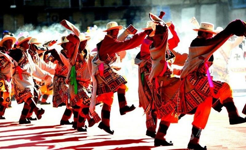 鍋莊有較嚴格的程式,首先由老年領舞、獻酒和哈達。鍋莊舞開始后,由男隊領頭,中、老年女隊隨后,青年女子最后。男隊領舞者必須是德高望重、能歌善舞的長輩,整個舞蹈過程中以他為指揮。鍋莊組織者排在第二位,主要是領唱。男女兩隊圍繞中心反復旋轉,呈現(xiàn)多種隊形,其中以嘉旋圖(八卦旋圖)隊形最具特色,造形十分優(yōu)美。